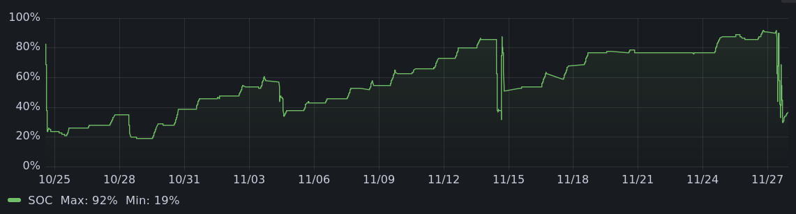diff --git a/blog/entry/aiming_at_December.mdwn b/blog/entry/aiming_at_December.mdwn index d73da9a2..9c9a6338 100644 --- a/blog/entry/aiming_at_December.mdwn +++ b/blog/entry/aiming_at_December.mdwn @@ -21,13 +21,12 @@ In September and October I built [a solar fence, of my own design](https://hachyderm.io/@joeyh/113177118703625033). [[!img blog/pics/solar_fence.jpg size=512x caption="Me standing in front of the solar fence, which is 10 panels long"]] +[[!img blog/pics/solar_fence_with_powerracks.jpg size=512x caption="Solar fence with some ballasted ground mounts in front of it, late evening light. Old pole mounted solar panels in the foreground are from the 90's."]] For the past several weeks I have been installing additional solar panels on ballasted ground mounts full of gravel. At this point I'm half way through installing my 30 panel upgrade. -[[!img blog/pics/solar_fence_with_powerracks.jpg size=512x caption="Solar fence with some ballasted ground mounts in front of it, late evening light. Old pole mounted solar panels in the foreground are from the 90's."]] - The design goal of my 12 kilowatt system is to produce 1 kilowatt of power all day on a cloudy day in midwinter, which allows swapping between major loads (EV charger, hot water heater, etc) on a cloudy day and running everything on a